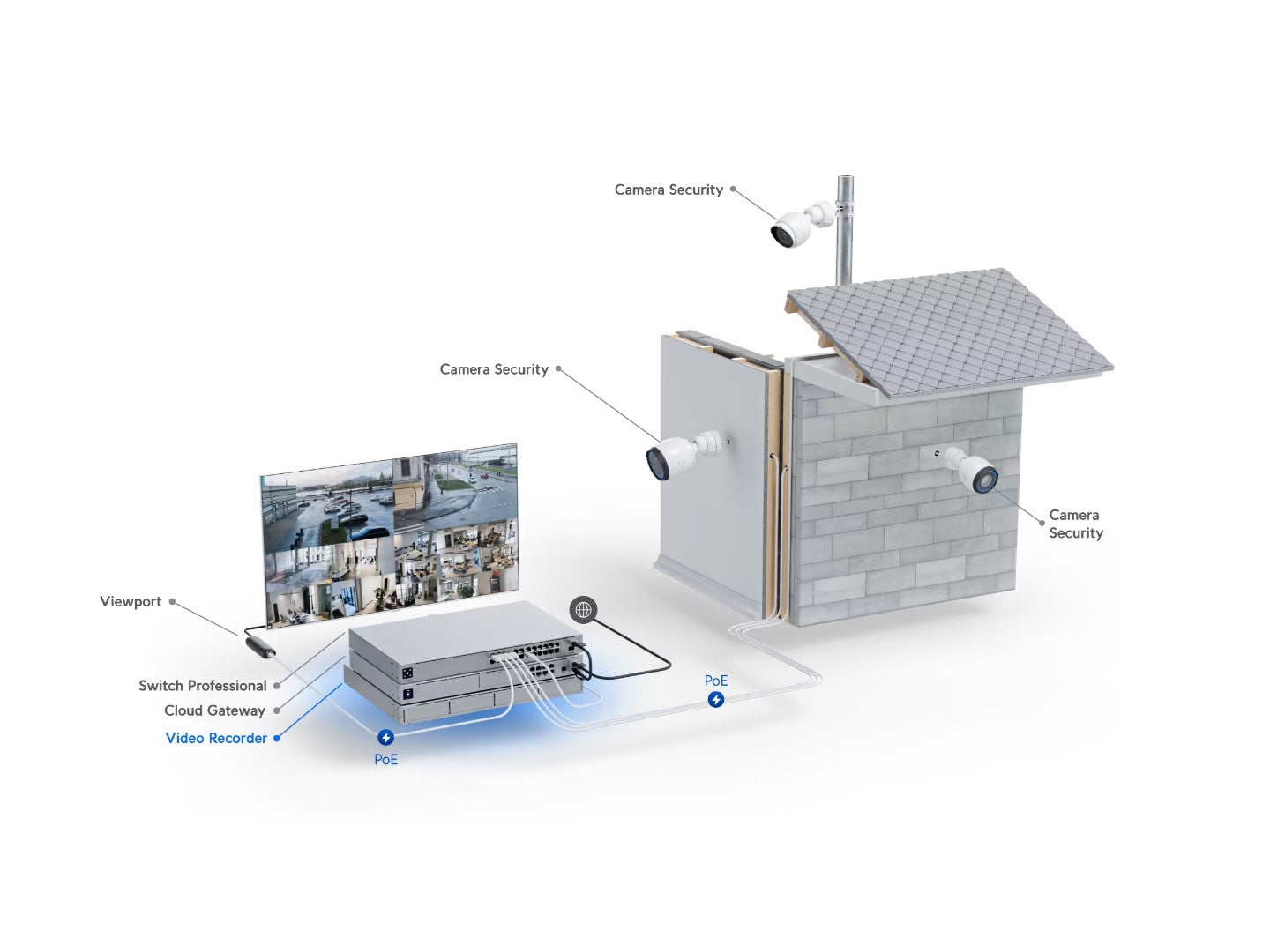 ✔NVR (Network Video Recorder):The PoE switch connects to an NVR. The NVR locally manages and records video footage.